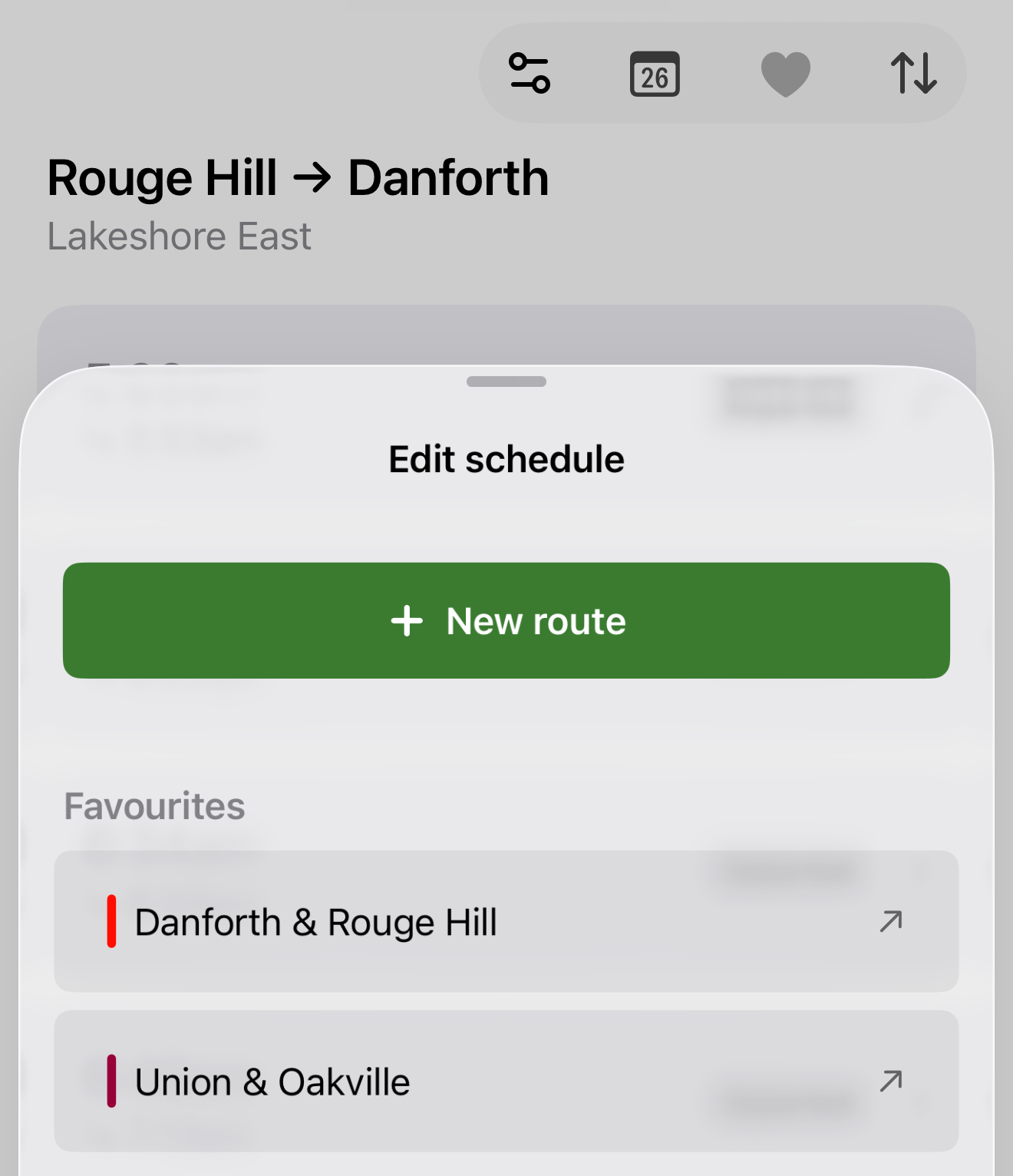 Previously, much of your schedule customization happened in the settings tab. This caused confusion for new users and slowed down existing ones. Now, changing routes and accessing favourites happens right where your schedule is: in the schedules tab.